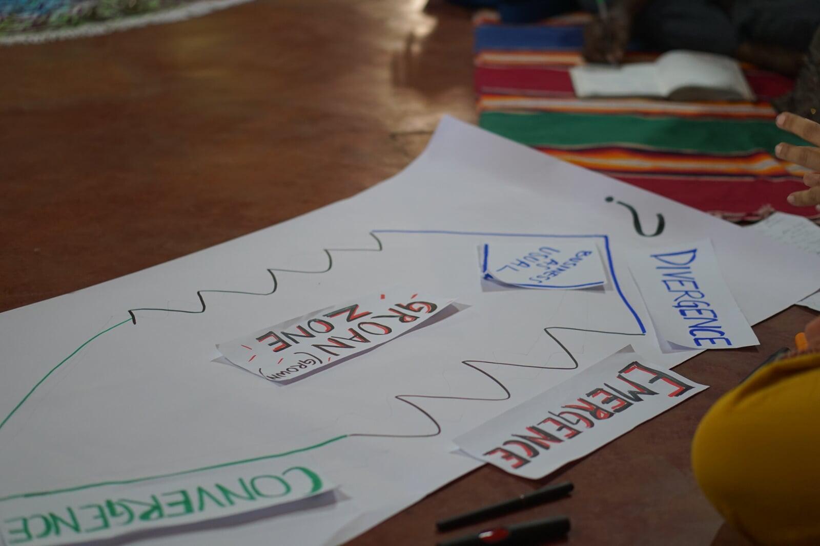 Joanna introduced everybody to the Diamond model of participation, which is a mental model in the AoH practice. Where we lead our journey from divergence through growth/groan zone towards convergence. Also it's important to give adequate time for the growth zone to be able to come to the newly emerged convergence