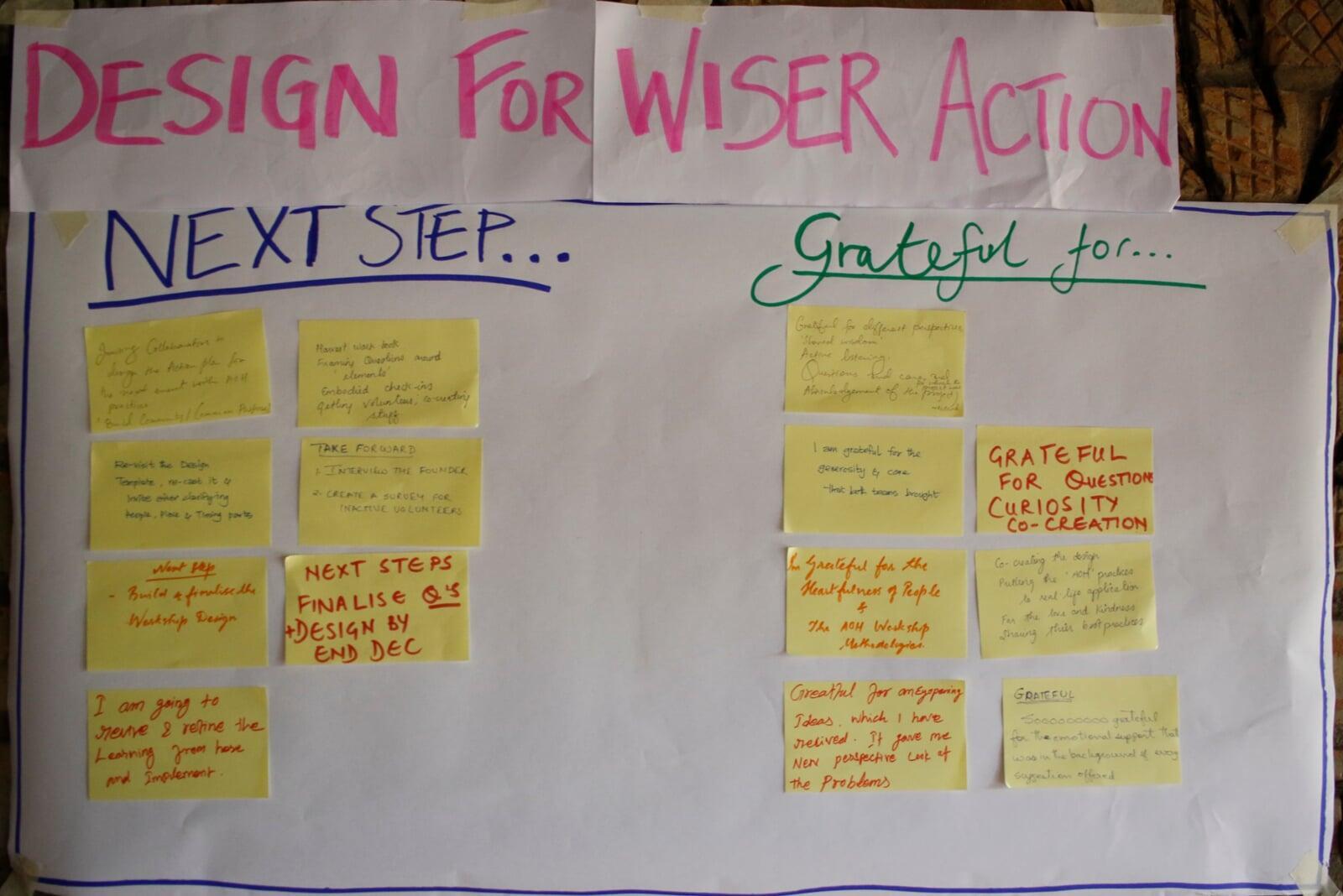 The check in was followed by Design for Wiser Action, where eight participants put forth their ideas of projects and plans where they intended to incorporate the methodologies and practices of AoH. We split into smaller groups where we looked at the broader overview (i.e., the purpose and need) of each project while also delving into the nitty-gritty (i.e., the location, the specific next steps, etc).
